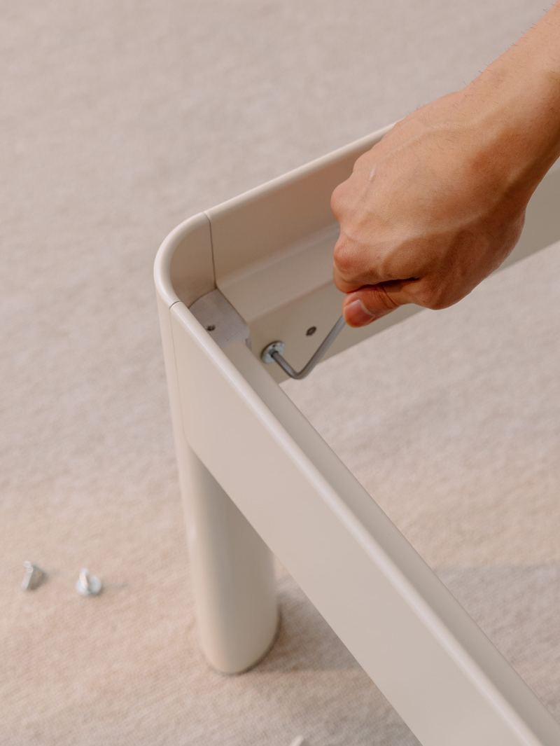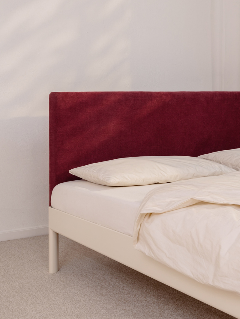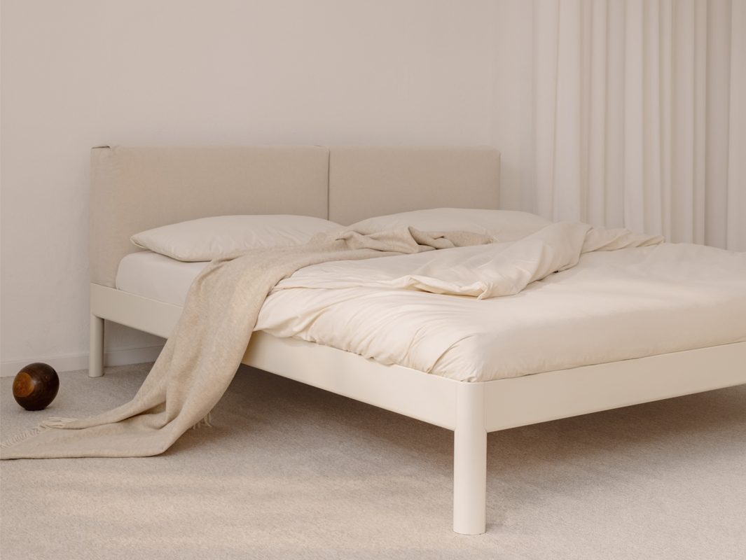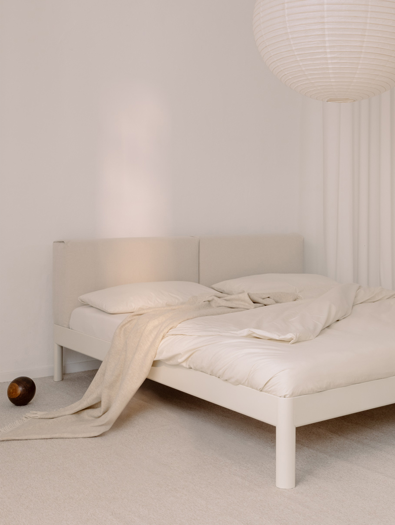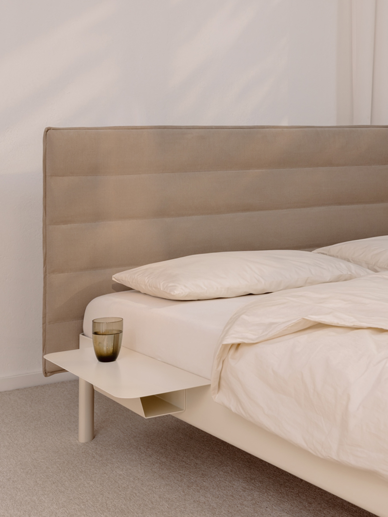 In contrast to the technical frame, the formal design of the bed is organically soft. The easy-to-assemble frame has four different optional headboards, allowing you to adapt the bed to your private space.